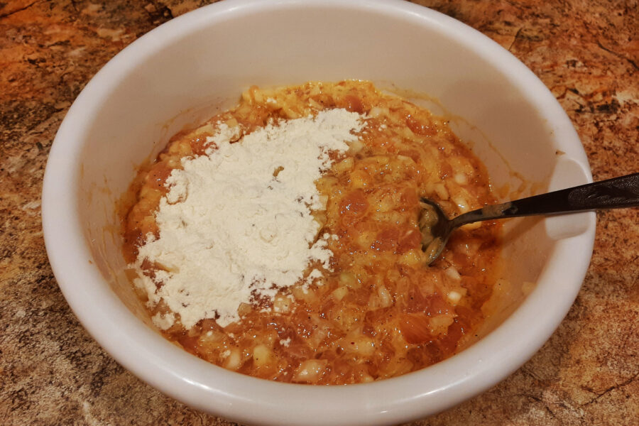 - Se amestecă făina în amestecul de cotlet. Acest lucru se face în porții mici pentru ca făina să nu formeze cocoloase. Amestecul ar trebui să fie destul de gros. Se lasă să stea timp de 10-15 minute. În acest timp, masa se va îngroșa și mai mult din cauza umflării făinii.