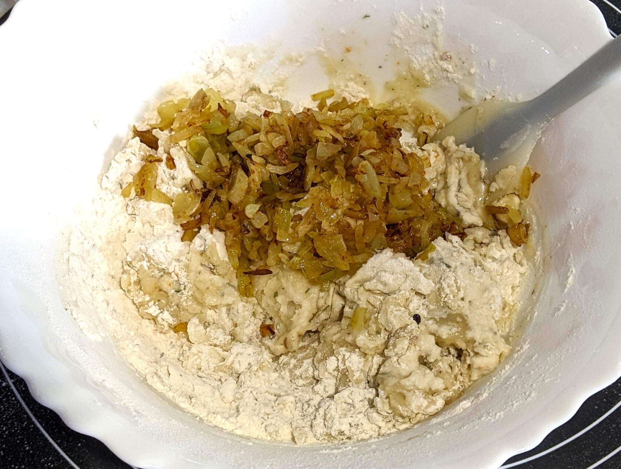 - Amestecati faina cu condimentele si praful de copt. Daca preparati aluatul cu apa, adaugati jumatate de lingurita de sare. Apoi turnati apa (saramura) si uleiul vegetal in vasul cu faina, apoi adaugati ceapa.