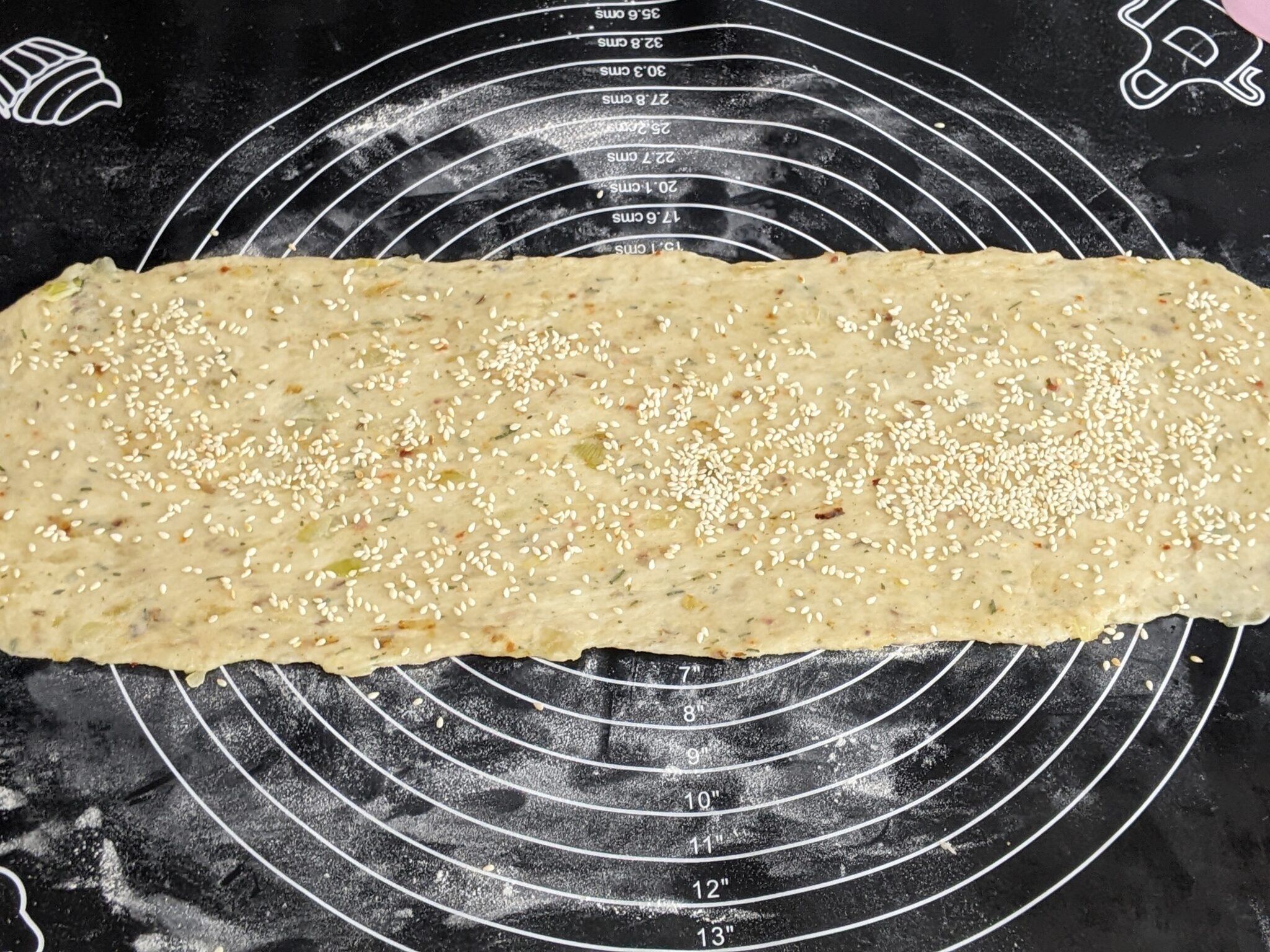 - Intindeti cu un sucitor fiecare parte de aluat intr-un dreptunghi. La dorinta puteti presara seminte de susan peste aluat.