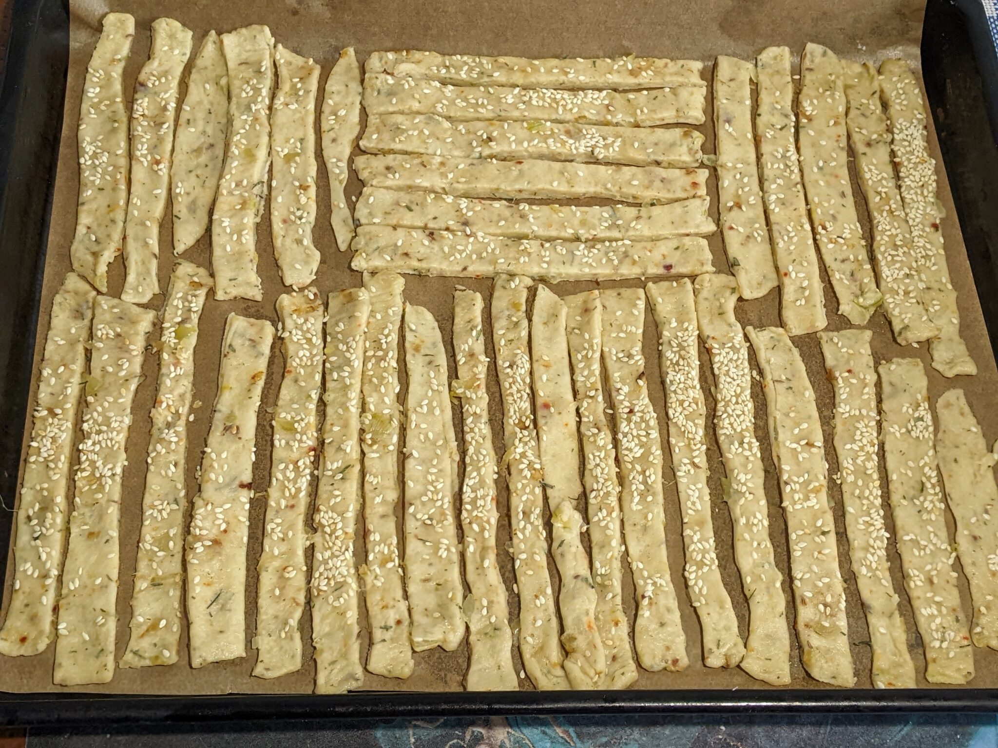 - Taiati aluatul in fasii subtiri. Puneti fasiile de aluat intr-o tava, pe hartie de copt. Coaceti pana sunt gata. Eu le-am copt la 170°C timp de 30 de minute. Cuptorul dvs. poate coace mai repede daca cresteti temperatura cu zece grade. Deschideti cuptorul peste 15 minute si verificati daca biscuitii sunt gata.