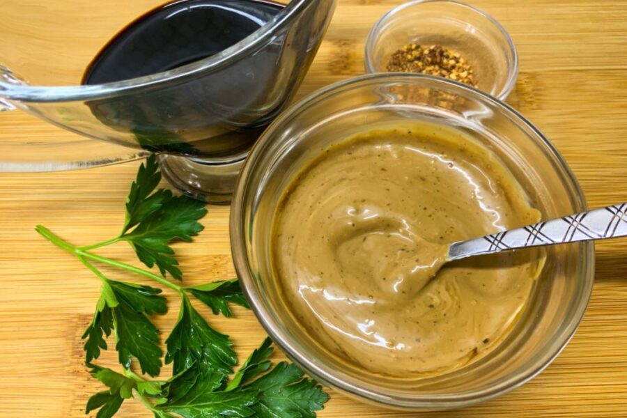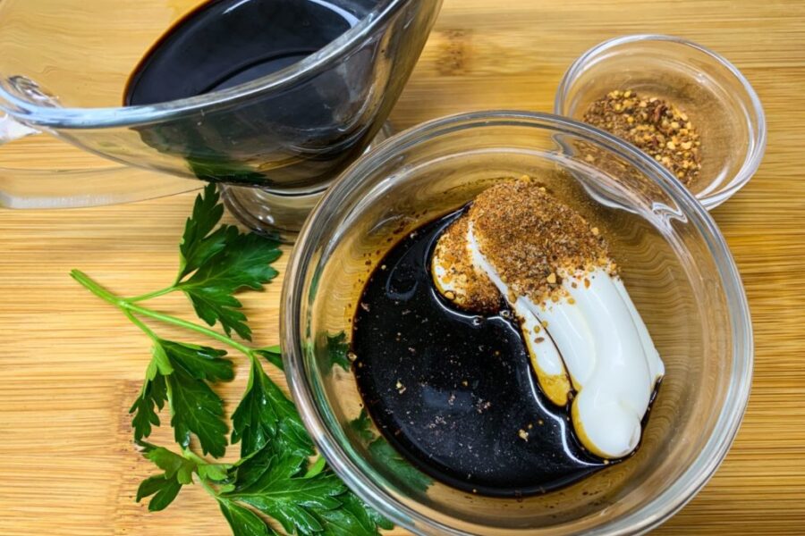 - Pentru a face sosul, turnați smântâna și sosul de soia într-un bol. Adăugați condimentele pentru pește și sare, dacă doriți.