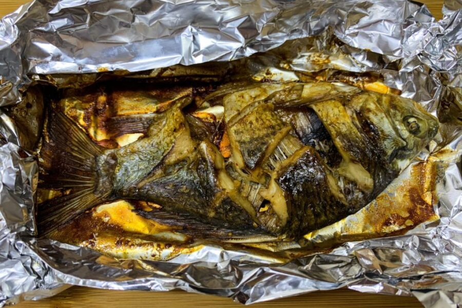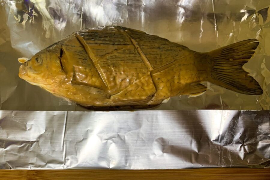 - Se îmbracă crapul cu amestecul în interiorul burții și pe toate părțile, astfel încât marinada să pătrundă în tăieturi. În acest fel, carnea va fi bine îmbibată de condimente. Așezați pestele pe o folie de aluminiu.