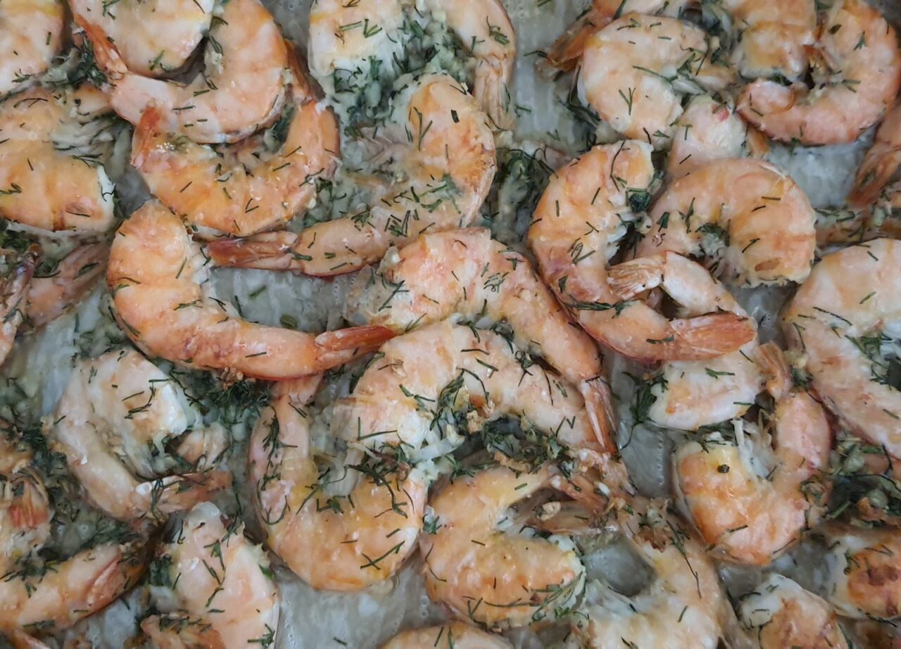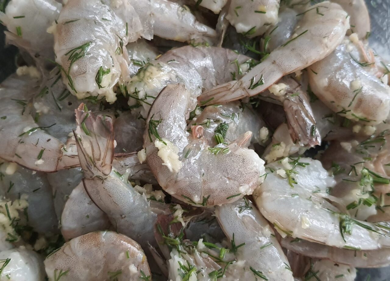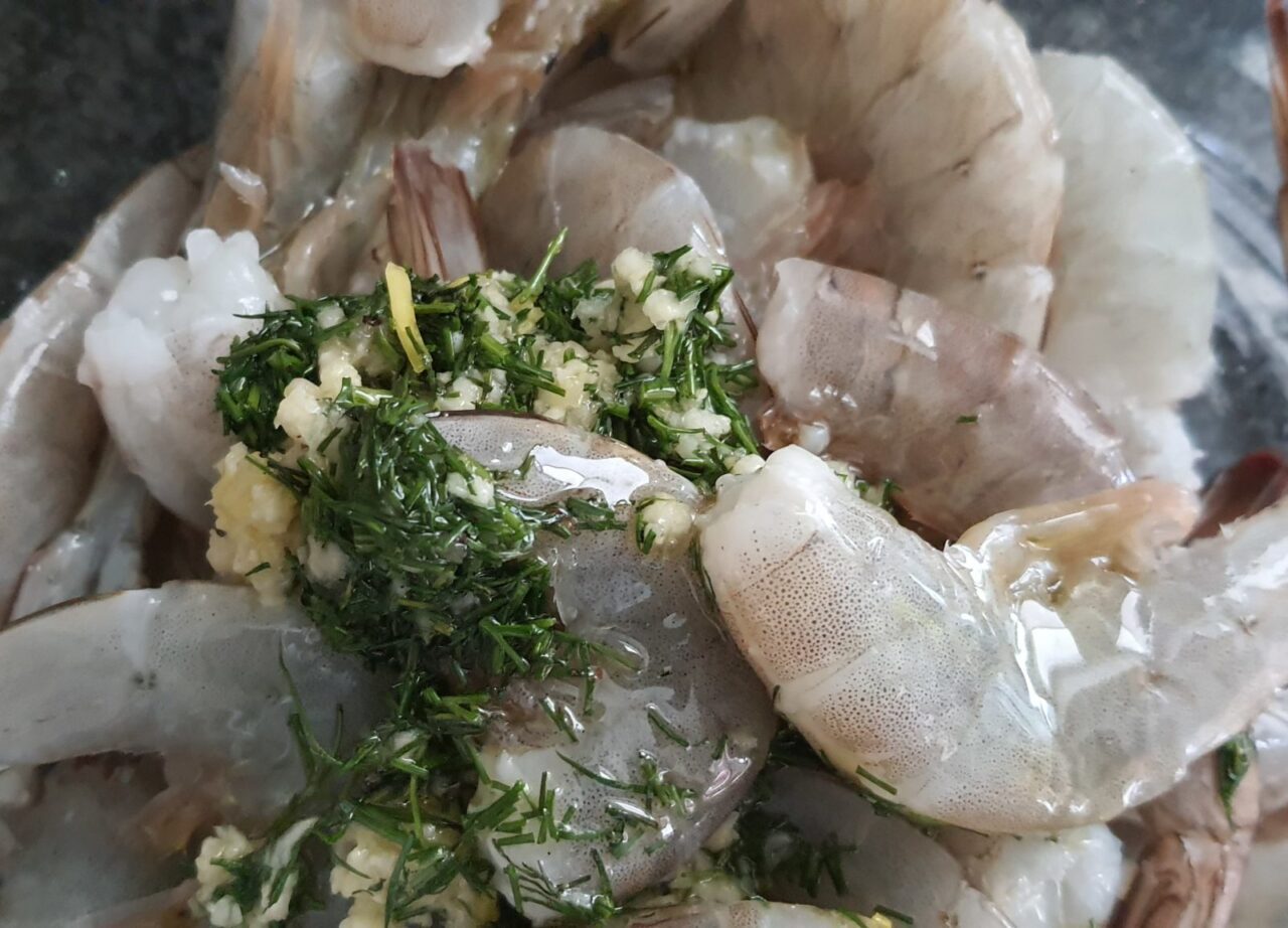 - Pe creveți se pune amestecul de mărar și usturoi, se adaugă 2 linguri de ulei de măsline și se adaugă sare.