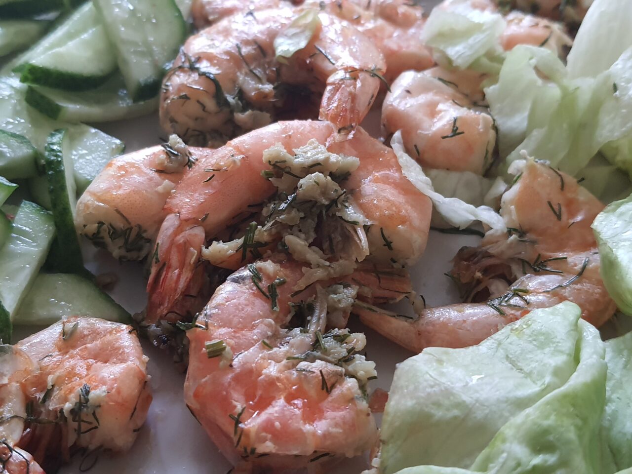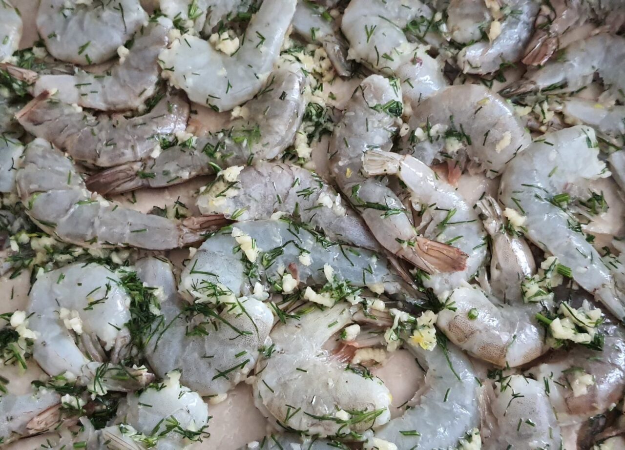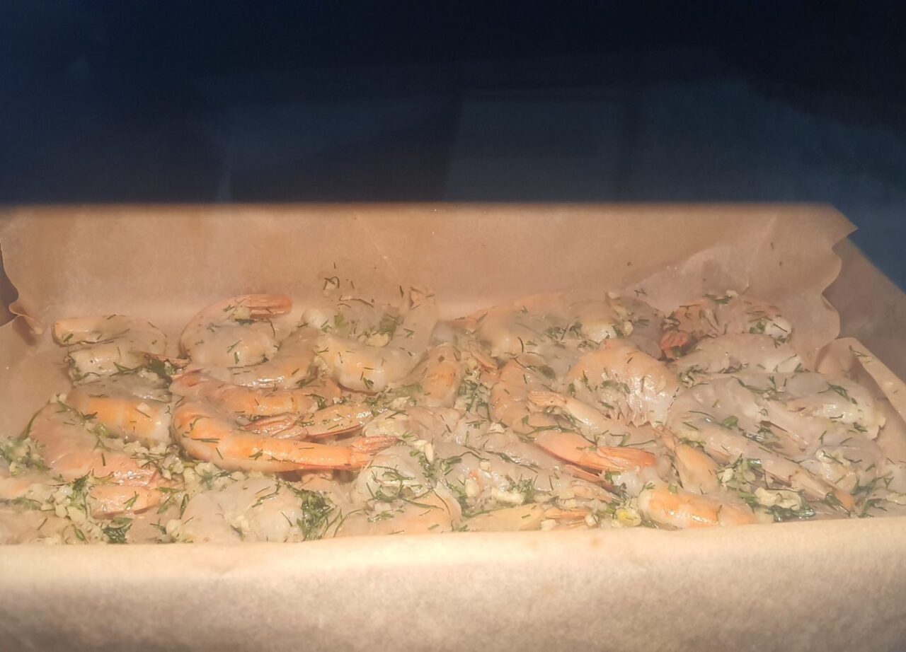 - Pe creveți se pune amestecul de mărar și usturoi, se adaugă 2 linguri de ulei de măsline și se adaugă sare.