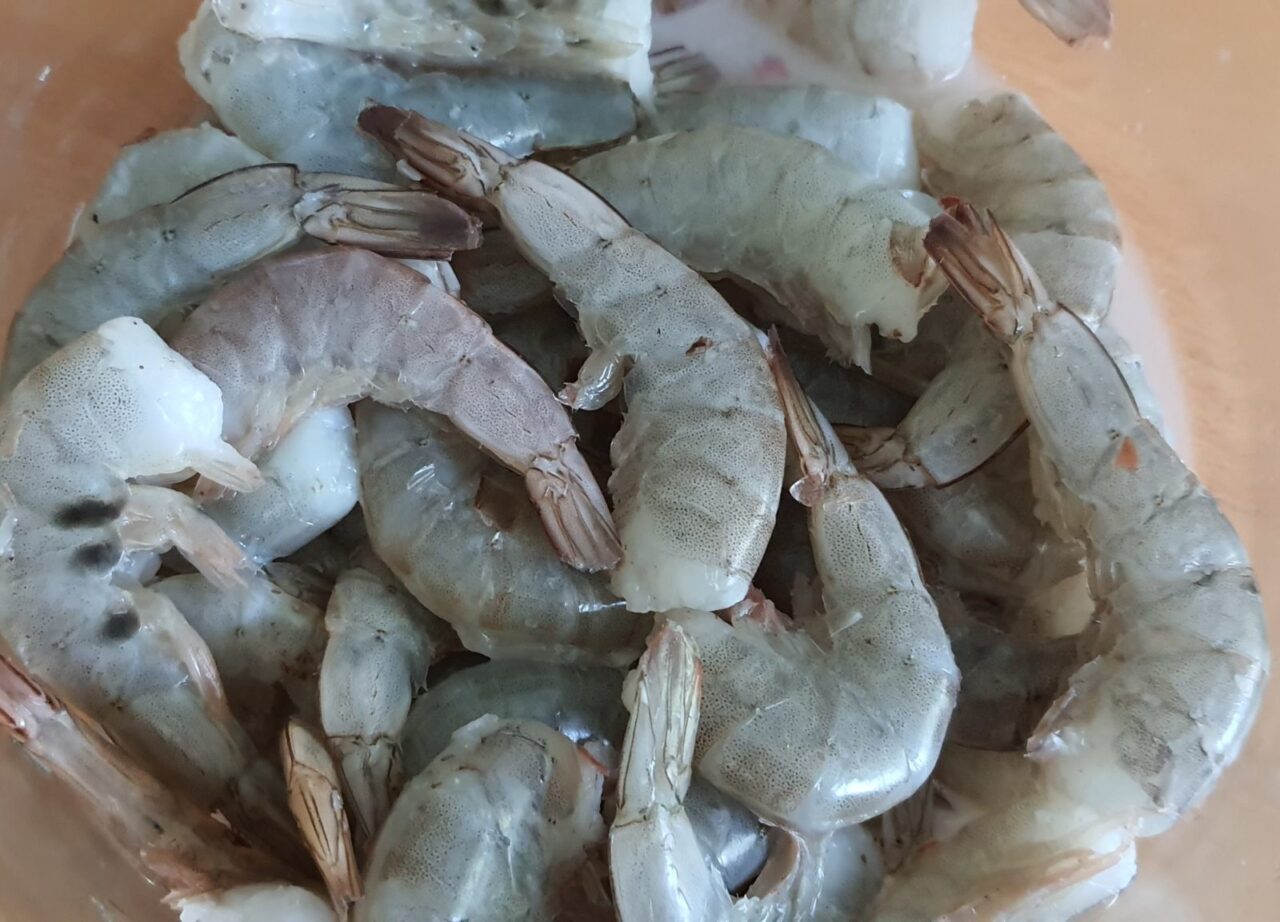 - Clătiți creveții decongelați cu apă.