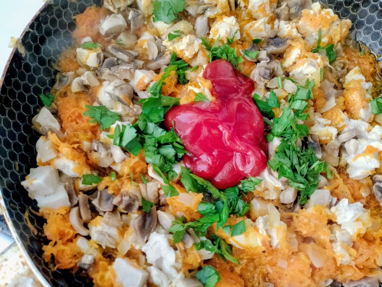 - Adaugati patrunjelul si sosul de rosii in tigaie.