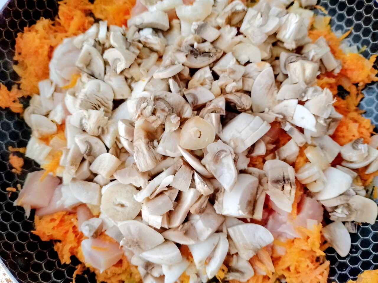 - Umpleti cuiburile cu umplutura obtinuta din ciuperci si carne de pui.