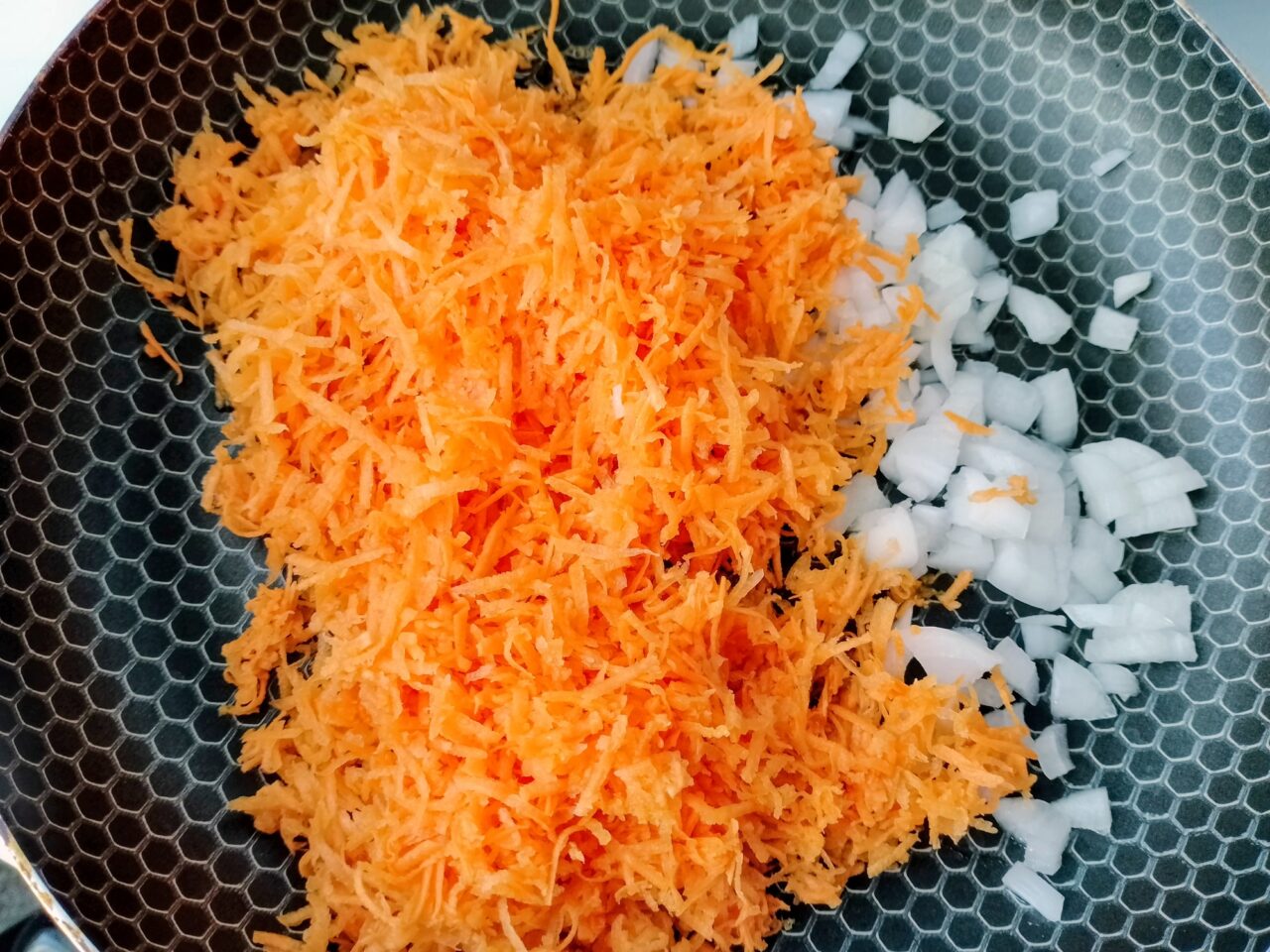 - Turnati uleiul in tigaie si adaugati ceapa si morcovii rasi.