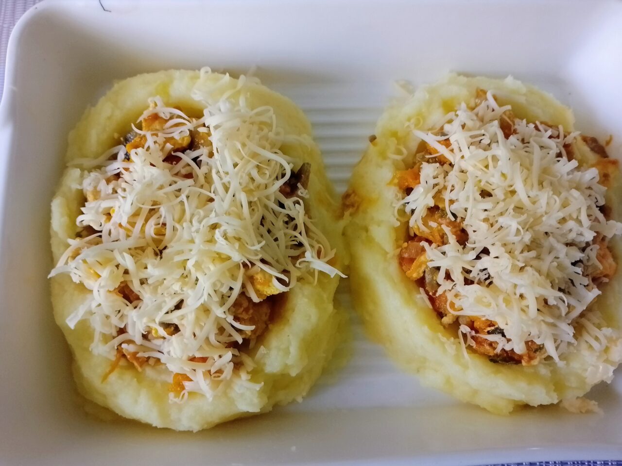 O mancare delicata si foarte gustoasa, preparata din piure de cartofi si legume cu pui si ciuperci, cu un gust cremos, va fi o optiune ideala pentru cina. Astfel de cuiburi sunt potrivite si pentru masa de sarbatoare. Piureul de cartofi cu cascavalul adaugat da o eleganta si o aroma nemaipomenita mancarii. Puteti servi cu o salata verde pentru a echilibra masa.