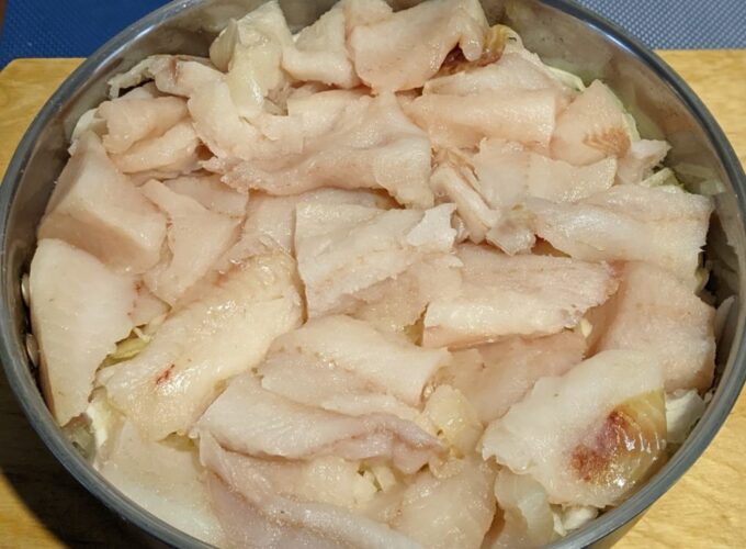 - Puneți ceapa tocată în cratiță și puneți deasupra bucățile de fileu. Nu vă fie teamă să puneți multă ceapă în cratiță. Dacă luați doar câteva cepe de mărime medie, peștele nu va avea un gust la fel de bun!