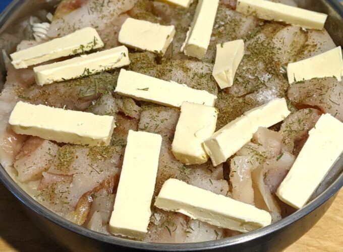 - Se toarnă 200 ml de apă, se sărează și se condimentează. Se pun bucățile de unt deasupra și se aduce totul la fierbere. Reduceți focul la minimum și fierbeți peștele sub un capac timp de 25 de minute.