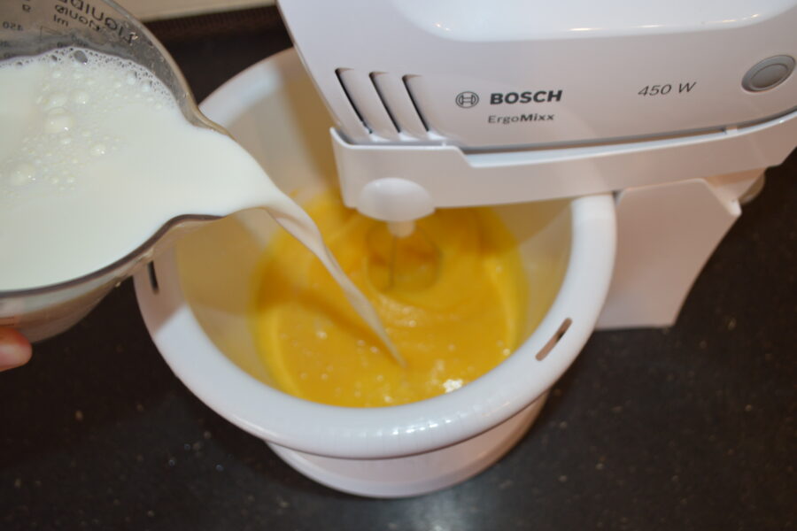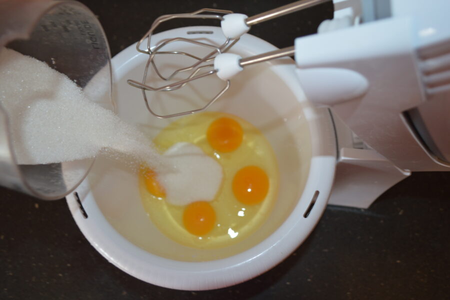 - Aluatul de clatite: in bol adaugati ouale si zaharul, bateti bine cu mixerul.
