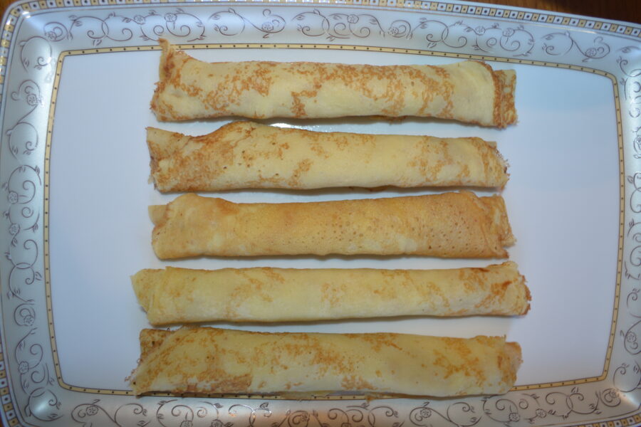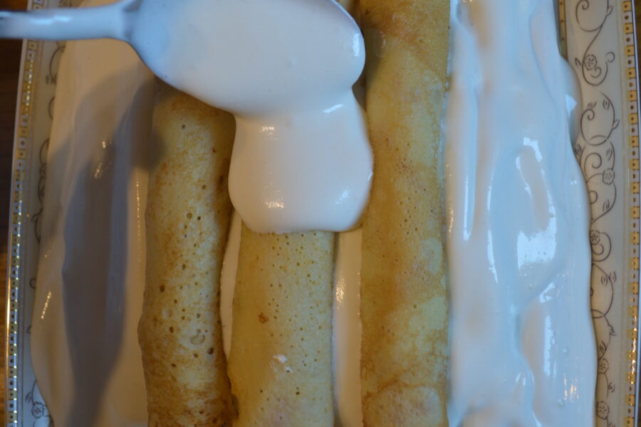 - Dupa ce clatitele s-au racit, luati cite una si asezati visinele intr-o linie, apoi rulati.