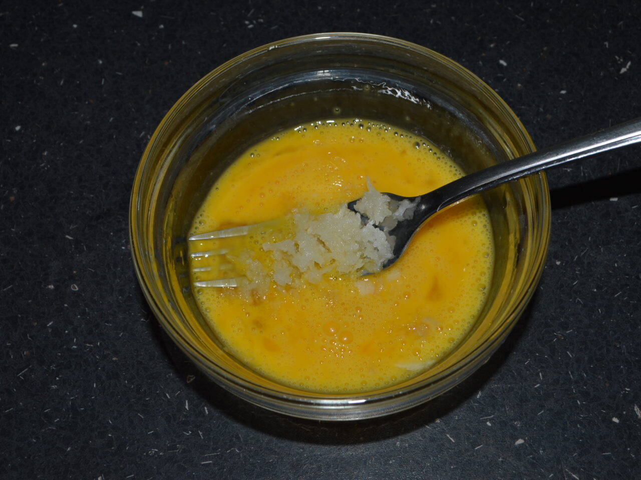 - Faceti mujdei din usturoi si adaugati la ouale batute. Amestecati.