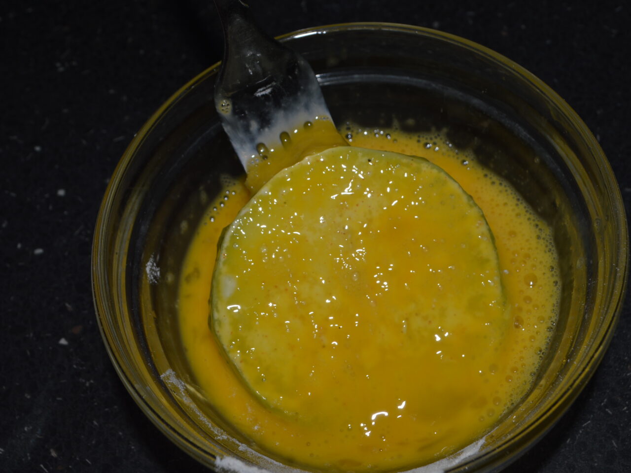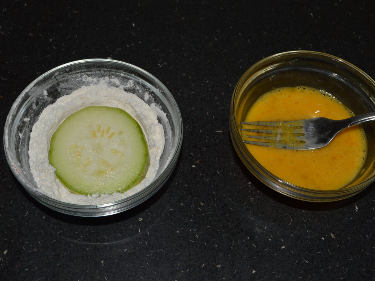 - Inmuiati cate un inel de dovlecel intii prin amestecul de faina, pe ambele parti.