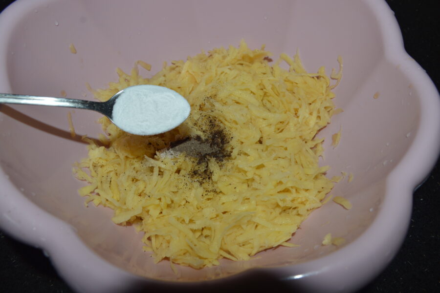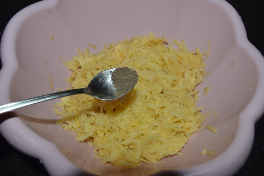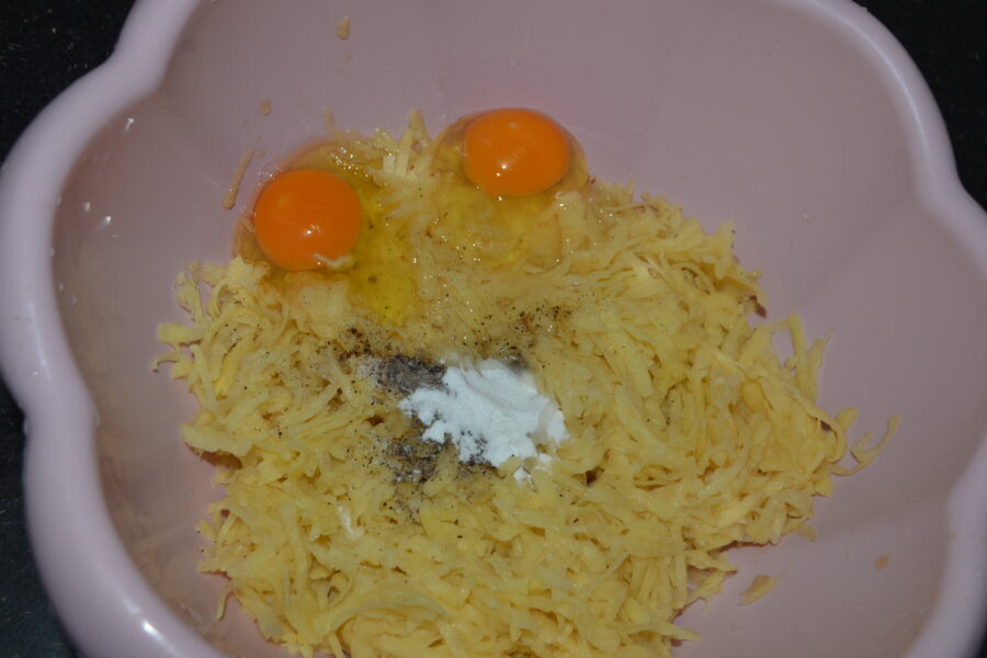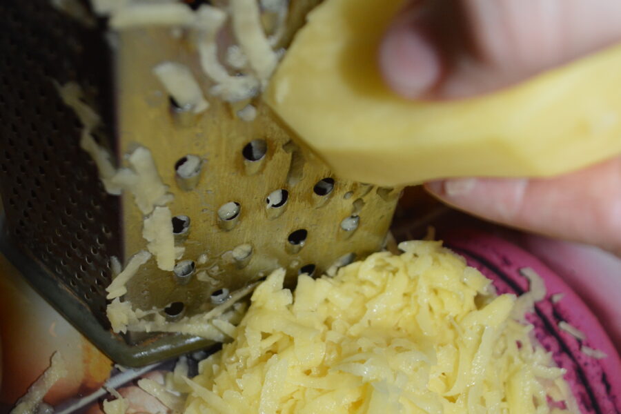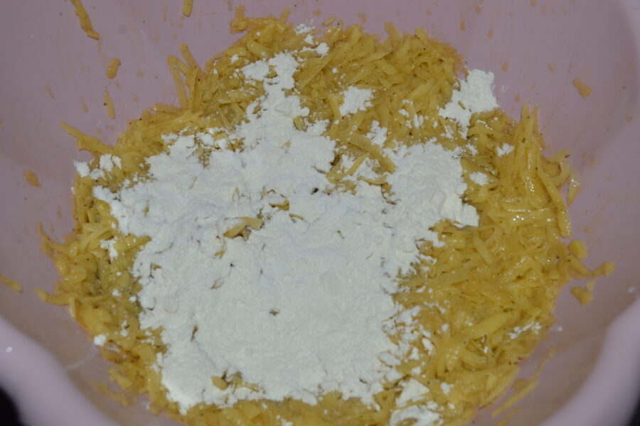 - Dati-i pe o razatoare grosiera. Scurgeti apa din cartofii deja rasi, va iesi multa apa din ei, apoi transferati-i intr-un bol uscat.