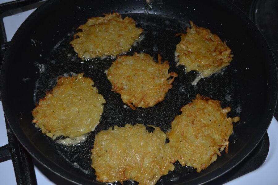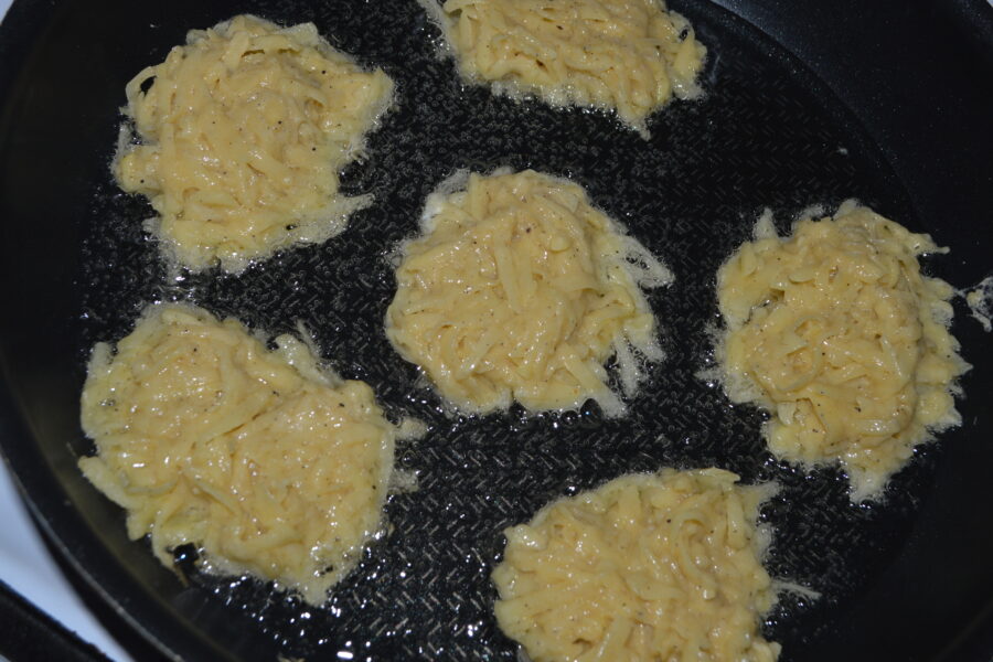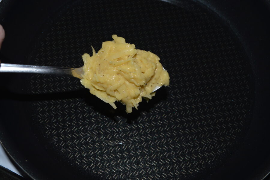 - Luati o lingura plina de amestecul de cartofi, si o puneti la prajit la foc mic, intr-o tigaie cu ulei incins.
