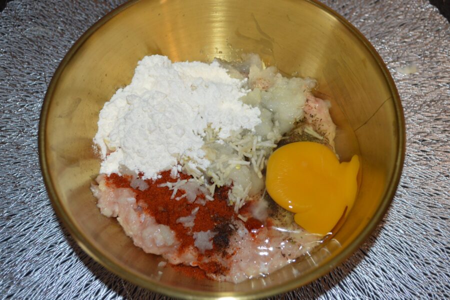 To make these chicken patties, you only need ground chicken, onion, garlic, bread, an egg, flour, salt, pepper, paprika and thyme. The bread soaked in water or milk keeps the patties moist, while the spices add warmth and depth without being overpowering.