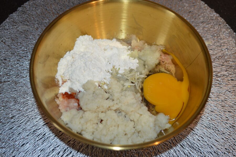 - Add the egg and 2–3 tablespoons of flour to the bowl.