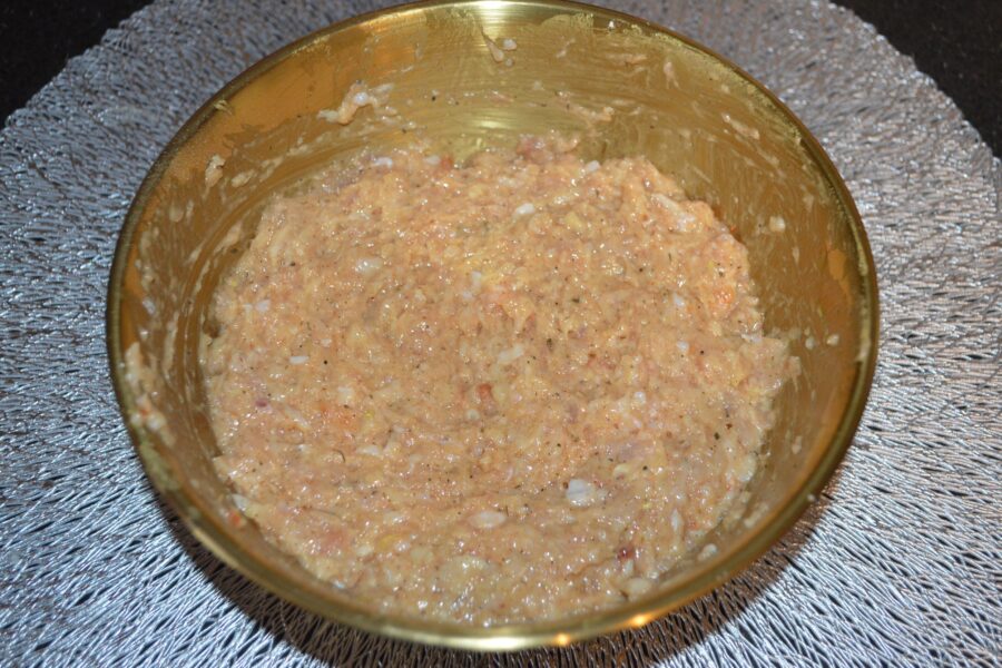 - Add the inside of the bread slices, soaked in water (or in milk if you have it), then gently squeezed.