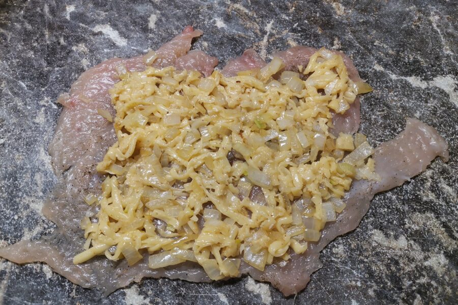 - Place the cheese and onion mixture on the chicken chop. Do not put the stuffing on one edge, to finish wrapping at this place. The roulade will hold tighter this way.