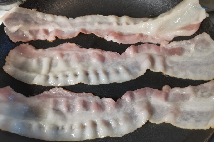 - Fry the bacon on both sides few seconds in a dry frying pan. Do not add oil or overcook the bacon.