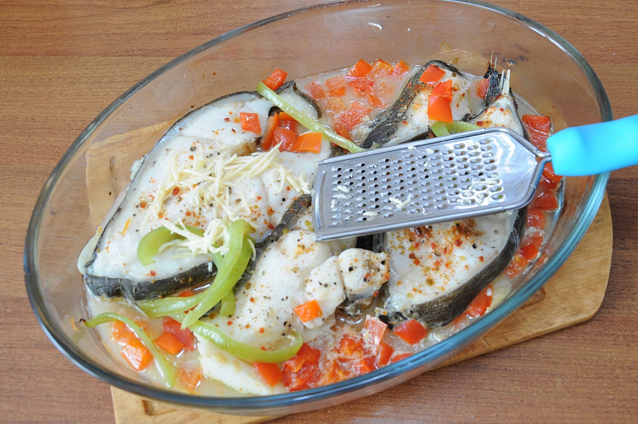 - Add a little sweet pepper on top of the fish.