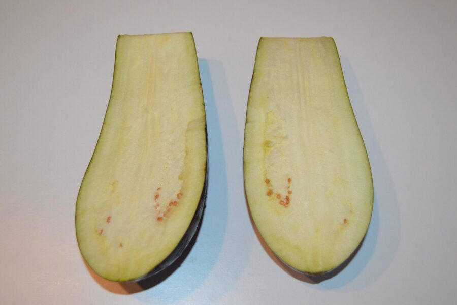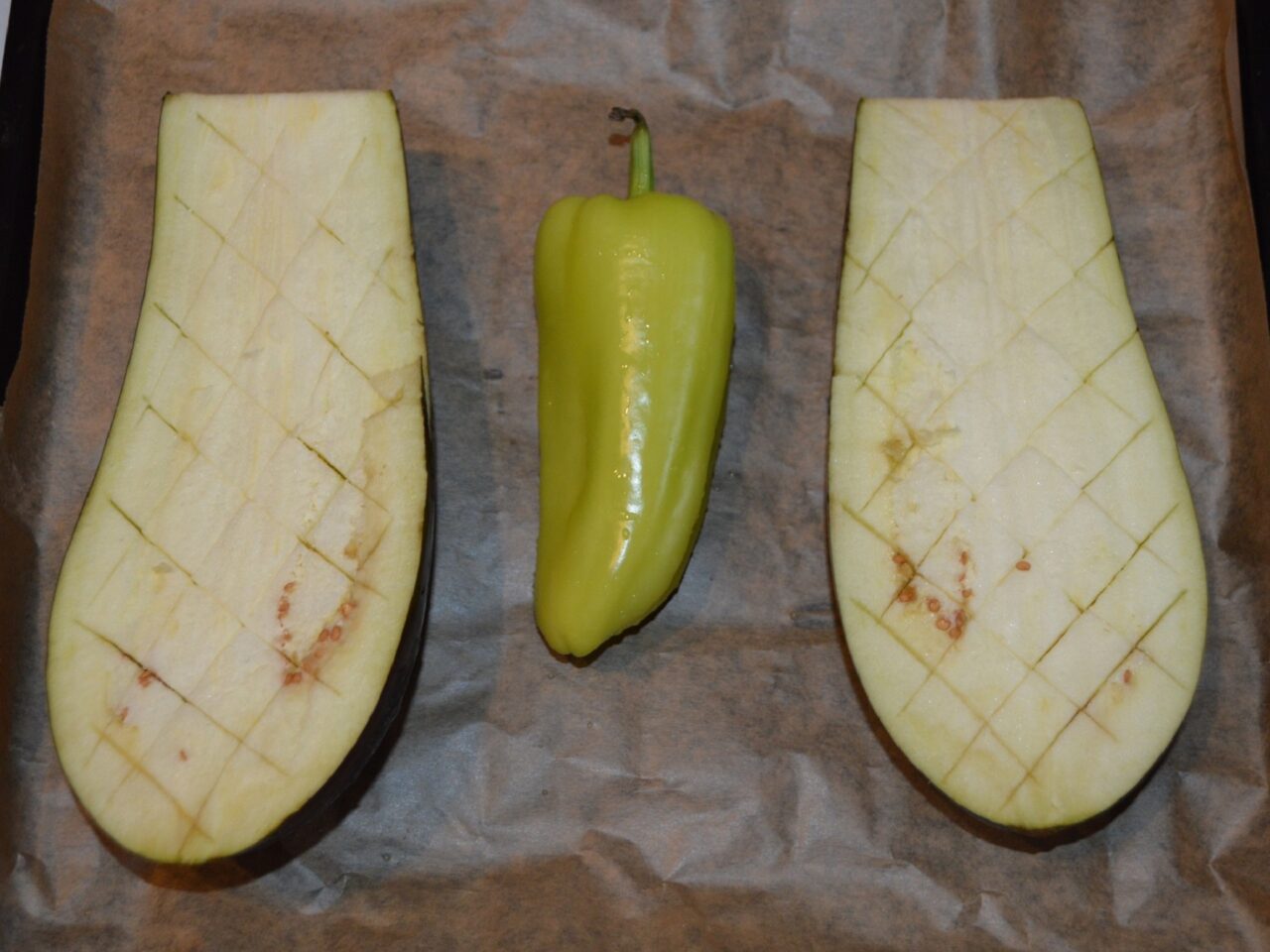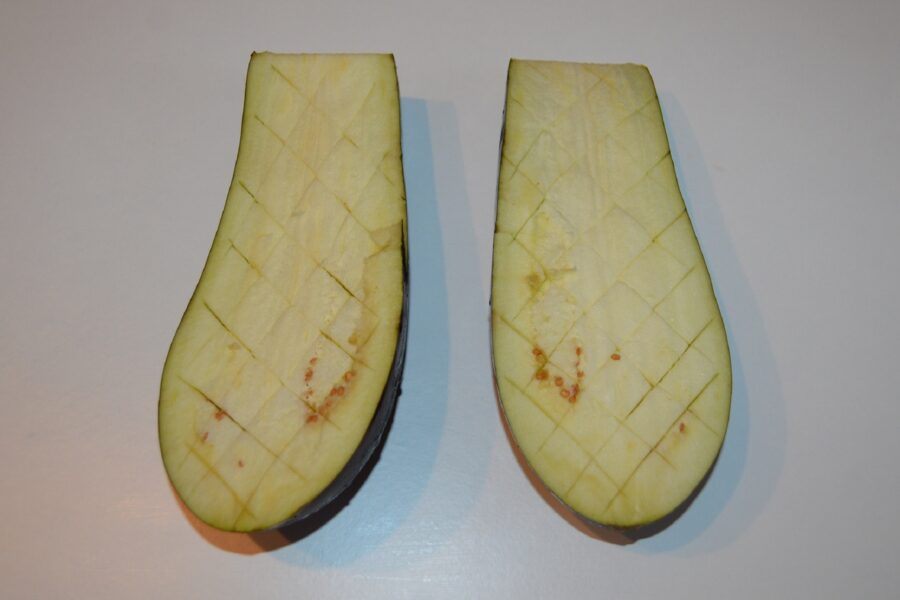 - Cut the flesh of the eggplant halves with the tip of a knife, forming diamond shapes.