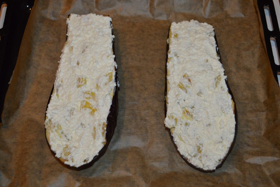 - Spread the filling over the eggplants. Bake in the oven at 180 degrees for 18-20 minutes.