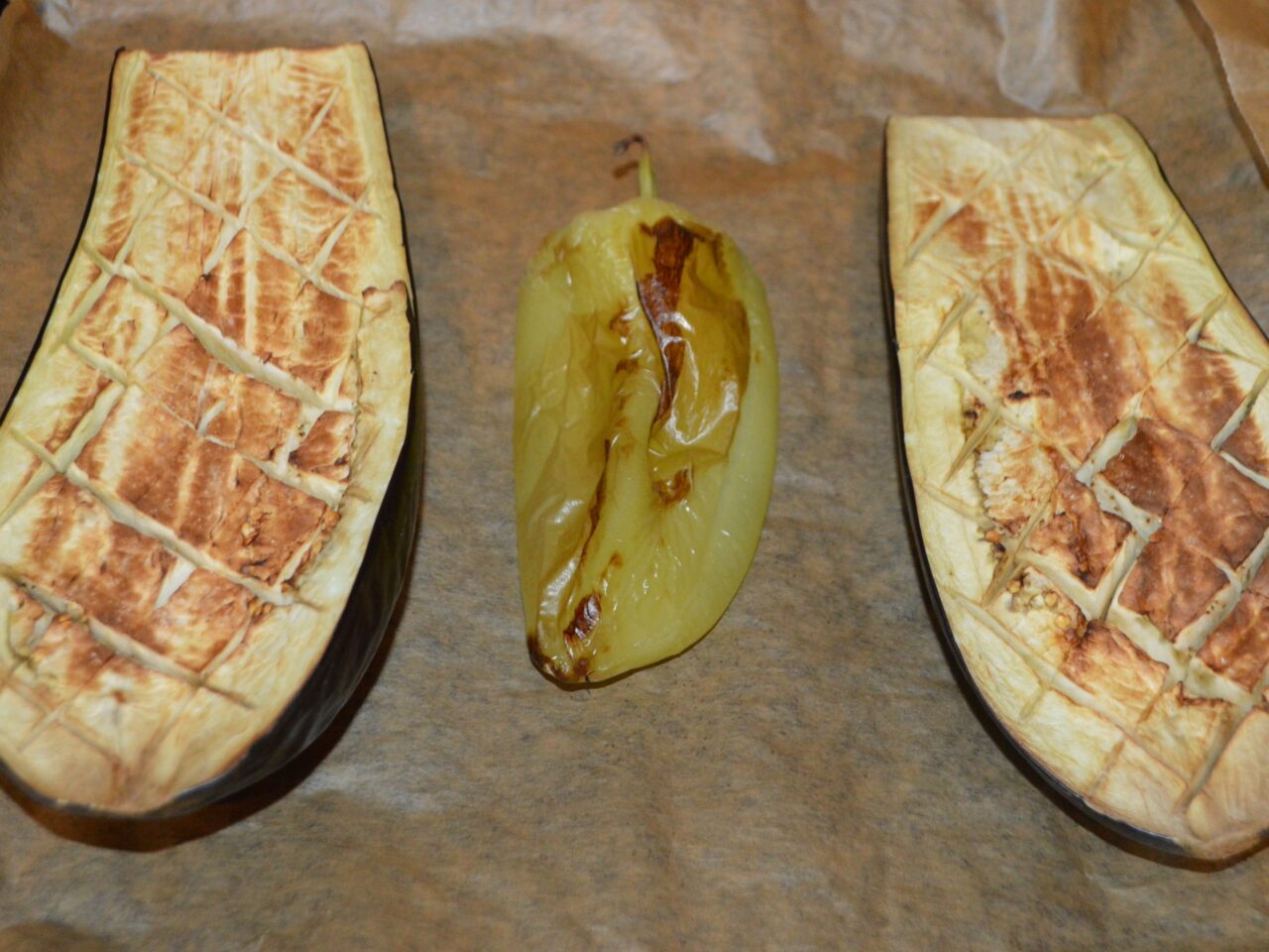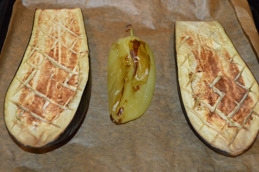 - Line a baking tray with baking paper and place the eggplant halves on it with the whole sweet peppers.