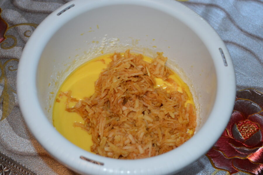 - Grate the apples on a coarse grater, leave them for 10 minutes, then drain the liquid from the apples with your hands. Add the grated apples to the mixture. You no longer need a mixer, just take a spatula or spoon and mix well.