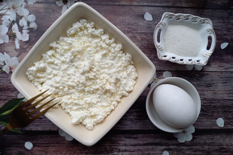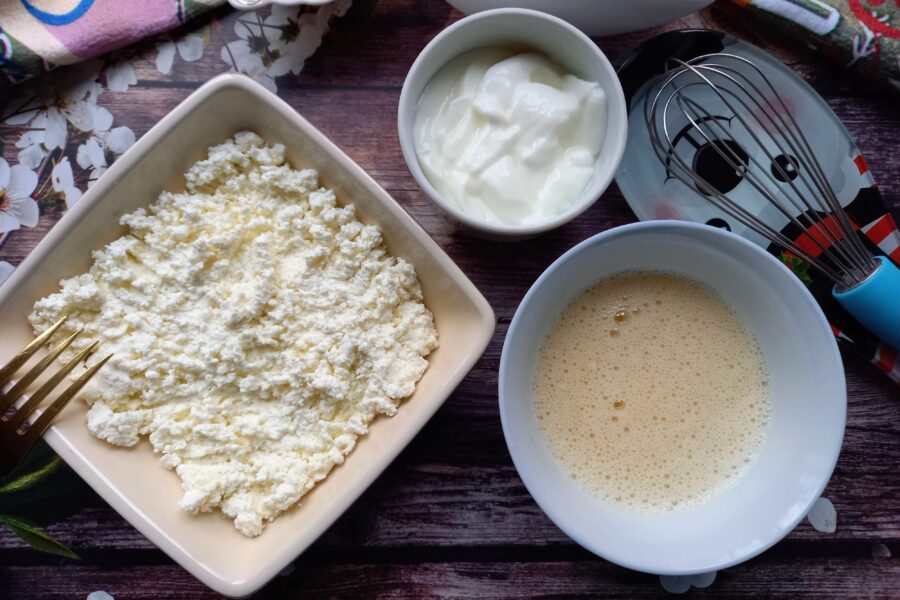 - Mix the cottage cheese with the yogurt and the sweet egg mixture.
