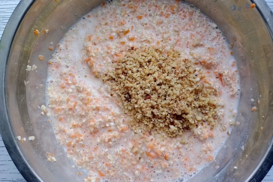 - Chop the carrots in a blender, then transfer them to a bowl along with the mashed bananas and rolled oats. If the oats are too large, it is best to chop them in the blender as well. Mix all the ingredients together.