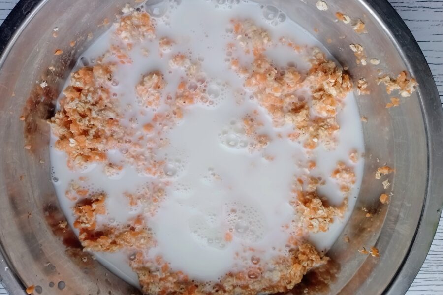 - Pour the warm milk over all the ingredients and let it rest for 15 minutes. Meanwhile, the rolled oats will swell and the dough will take on a paste-like consistency.