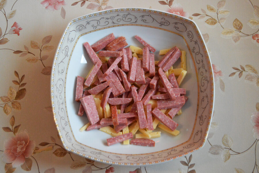 - Firstly, prepare a deep salad bowl. Cut the cheese into sticks and transfer it to the bowl.