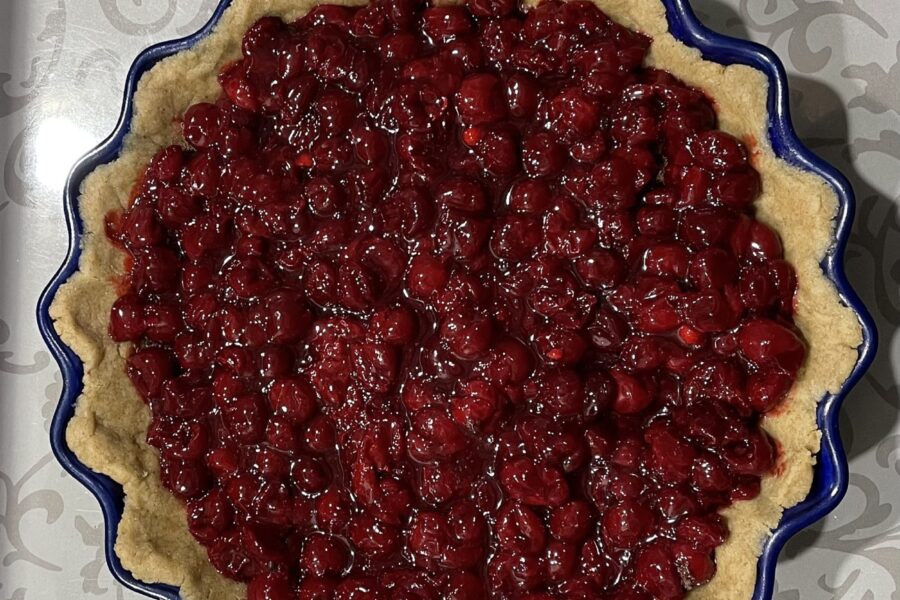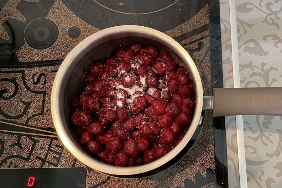 - Pour the cherries into a saucepan. Place over medium heat. When the cherries come to a boil, add the stevia and half of the starch. Cook for three minutes and remove from heat.