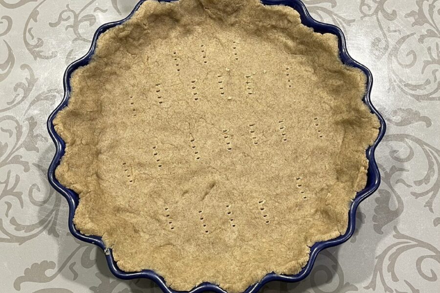 - Stretch the dough into mold with your hands to form a rim. Prick in several places with a fork.