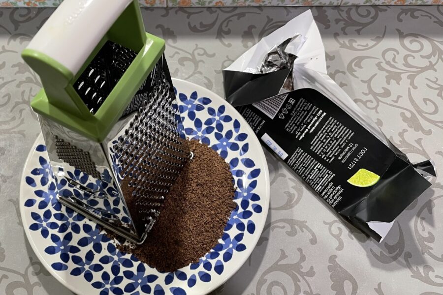 - Cool the dark chocolate and grate it. The spongy variety is easier to grate.