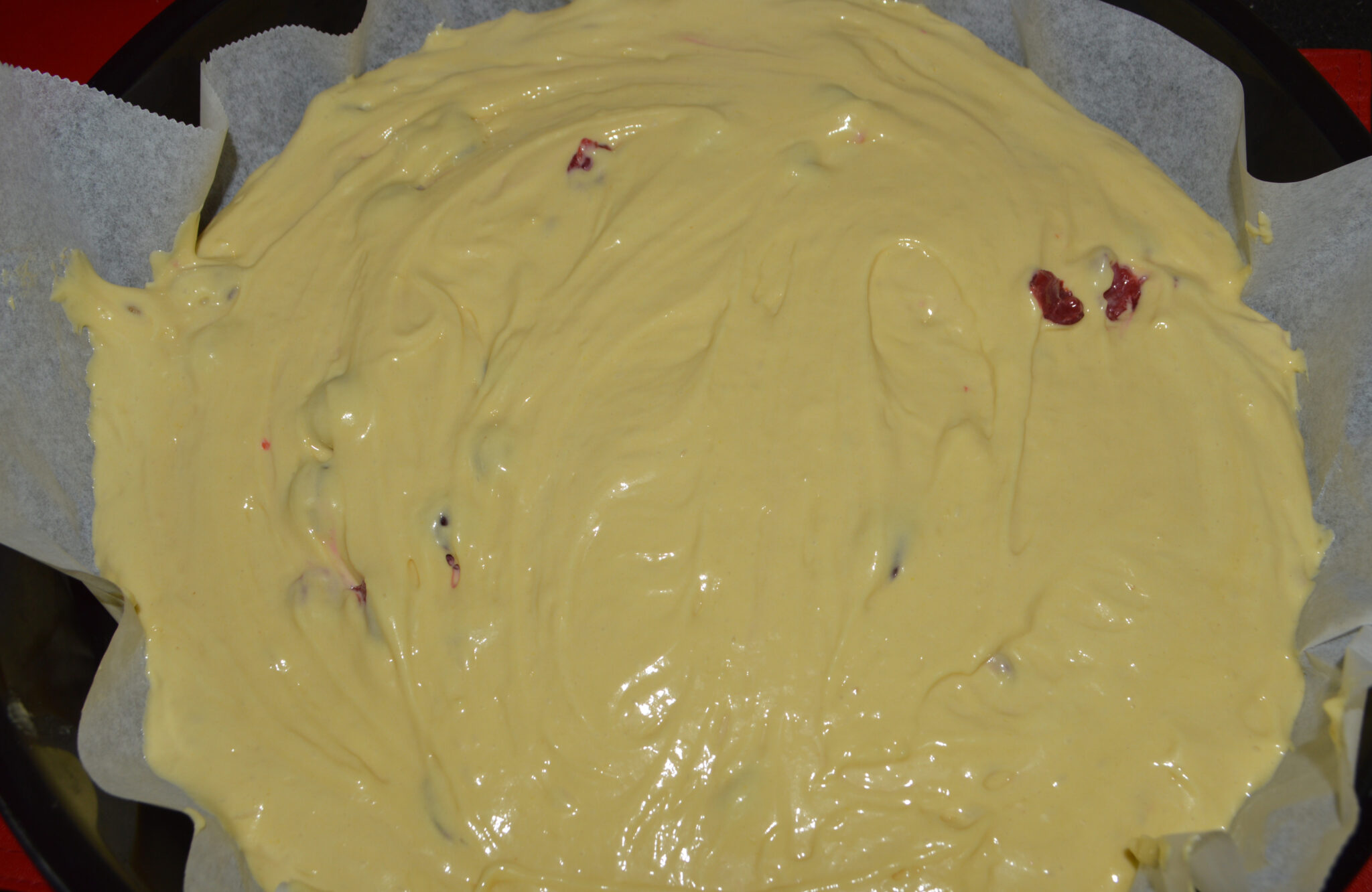 - Put 1/3 of the sour cherries in the mixture, and stir.