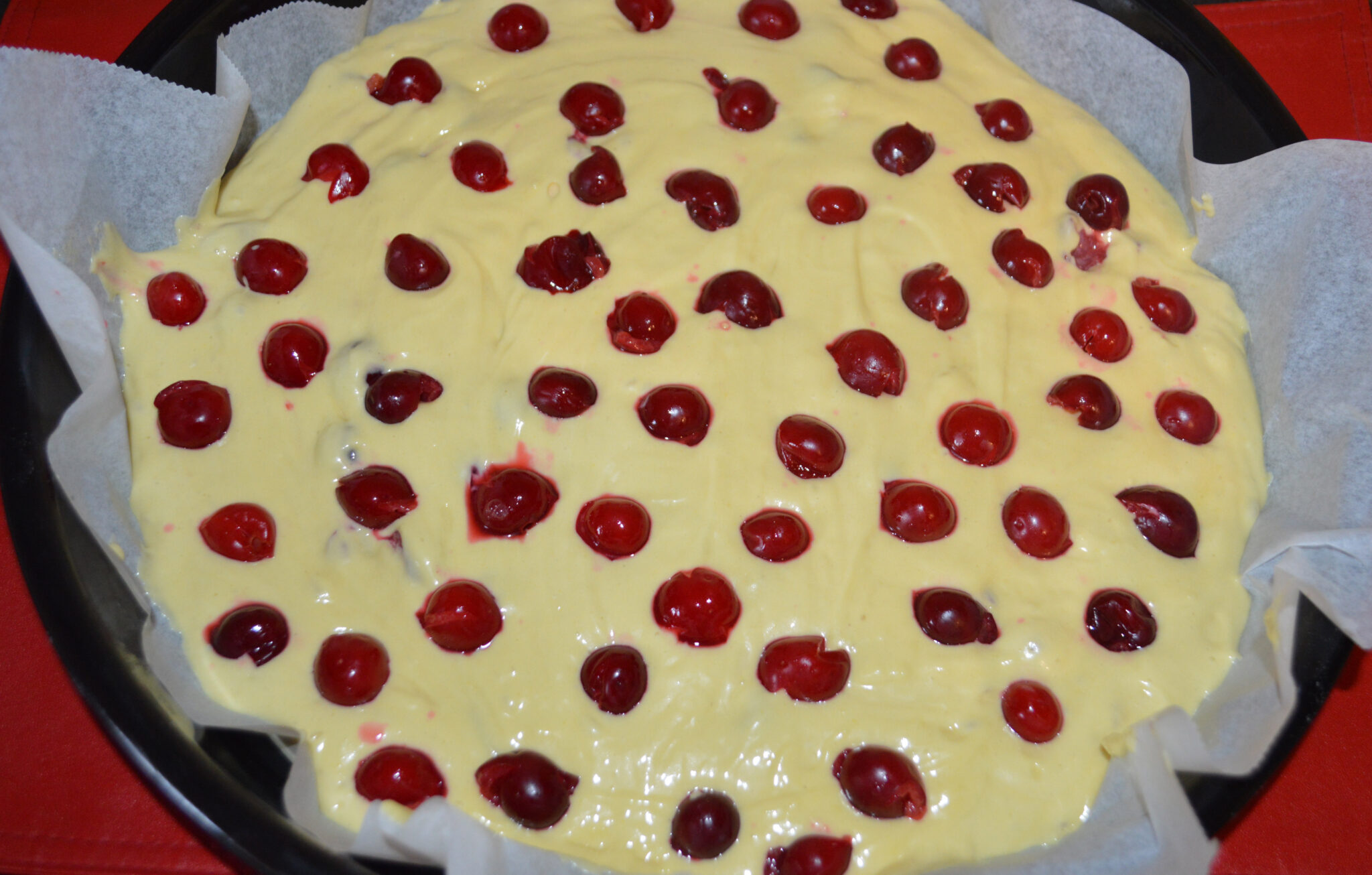 - Arrange the remaining sour cherries on the surface of the dough. Bake in a preheated oven at 175°C (347°F) for 20-25 minutes. Depending on your oven, it may take longer.