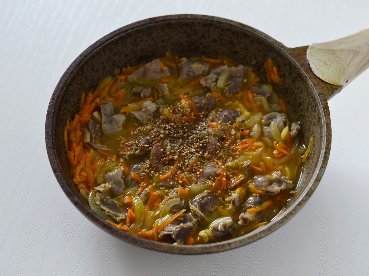 - Add the herbs, ground pepper, and dried garlic to the pan. Mix well again and leave covered for about 5-8 minutes.