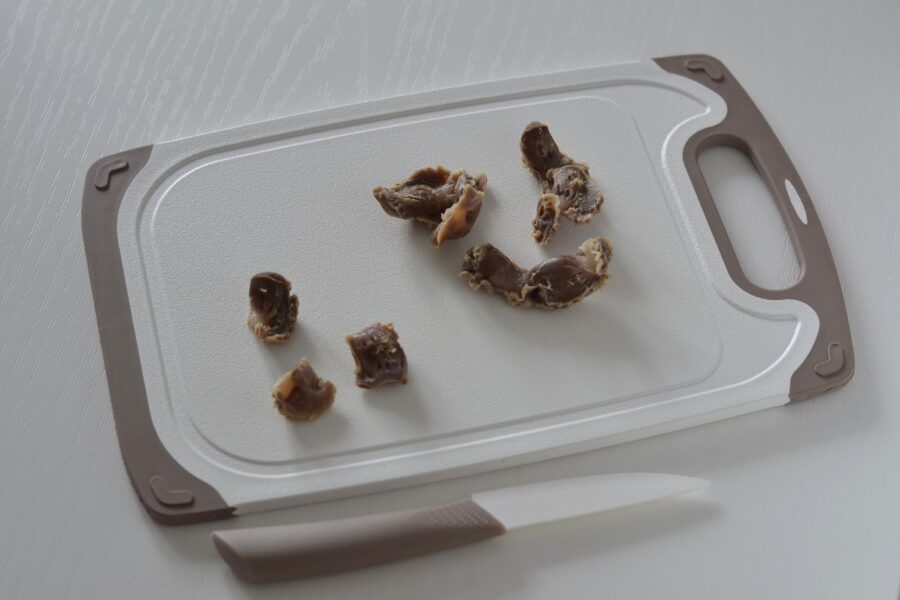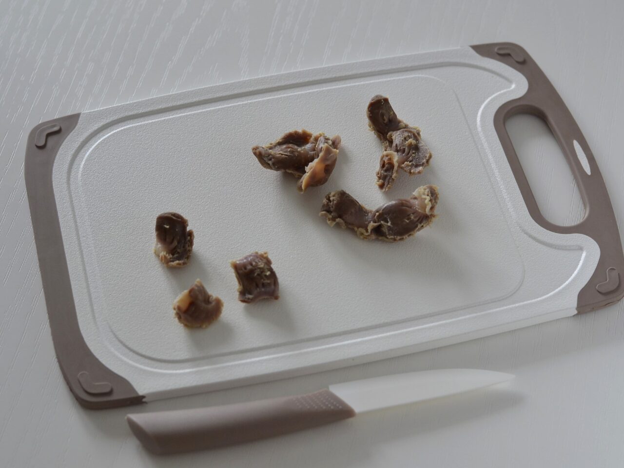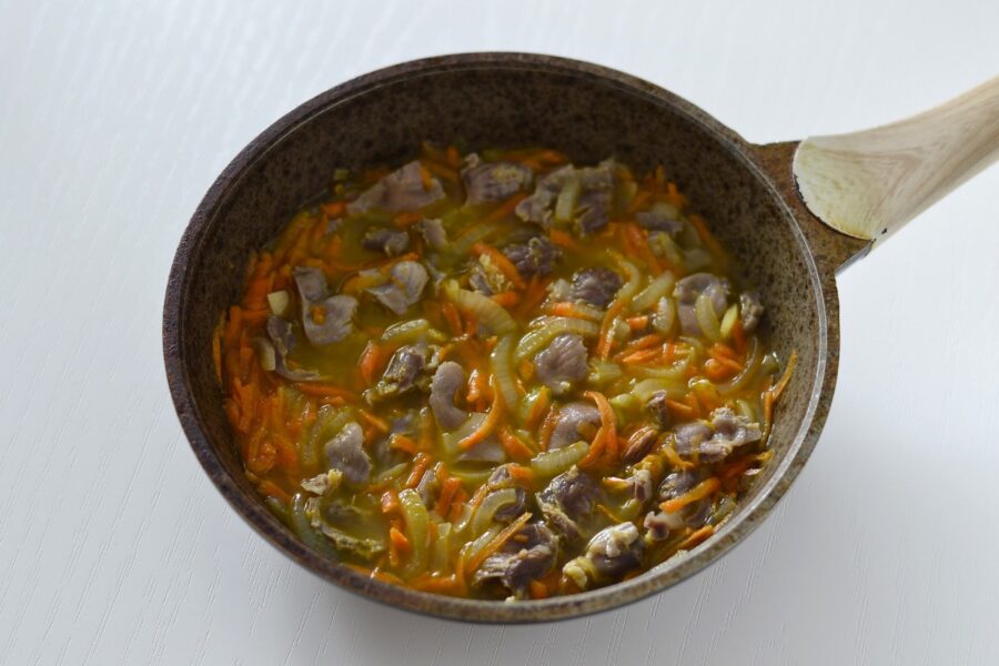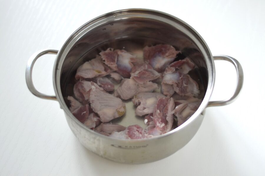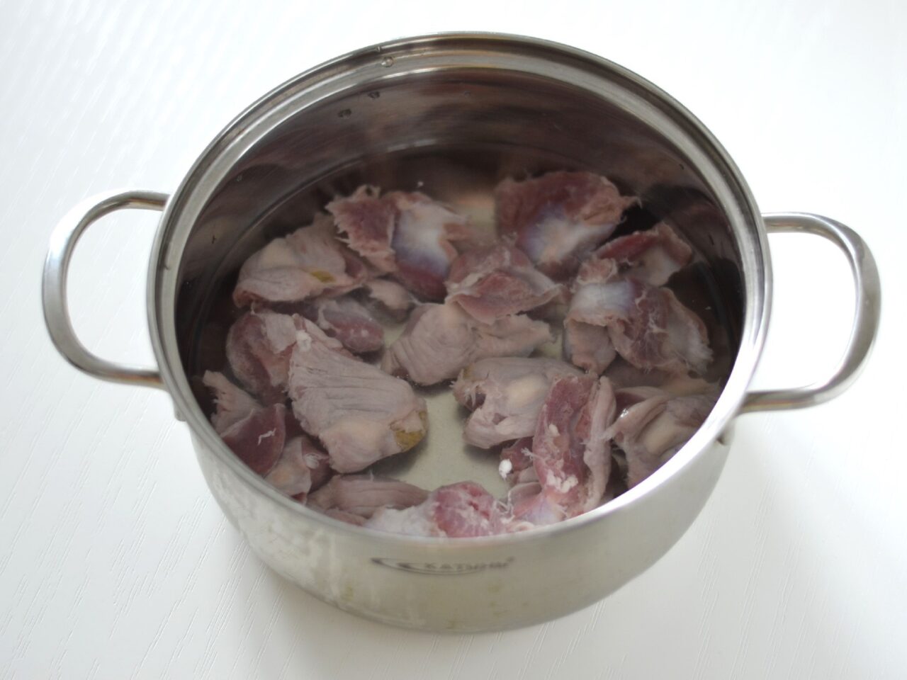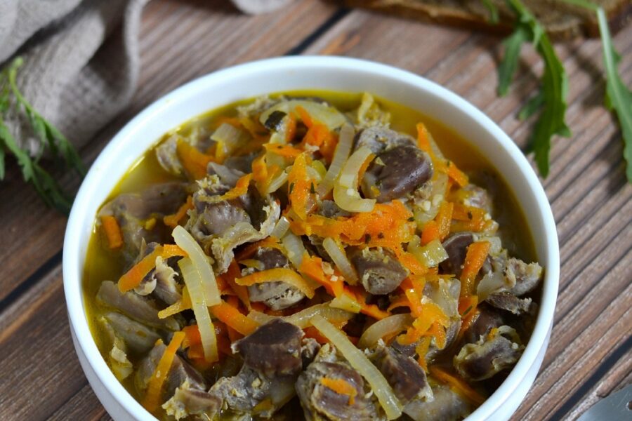 - Wash the chicken gizzards, remove the membranes, and boil them in 1 liter of salted water for 25-30 minutes.