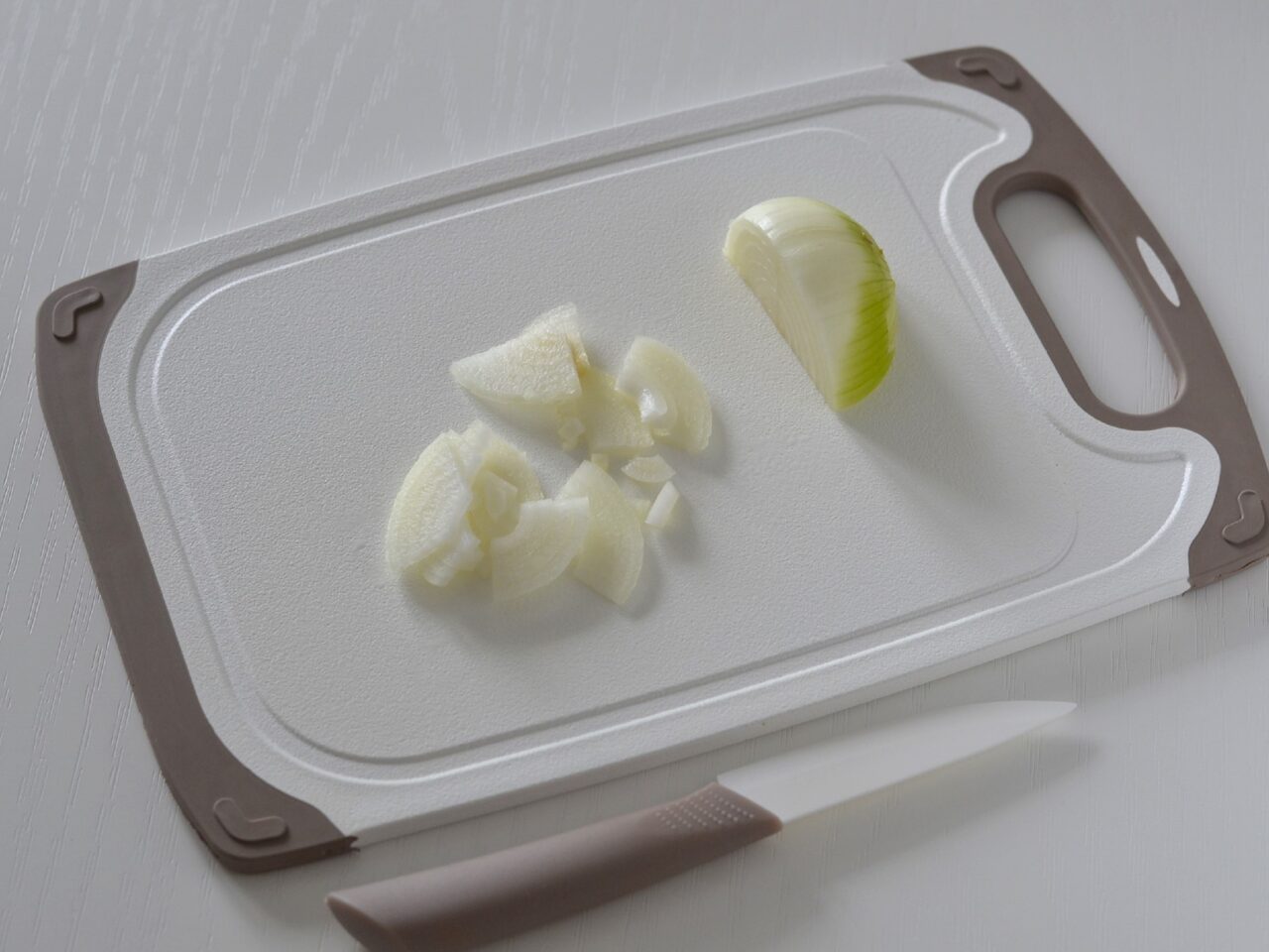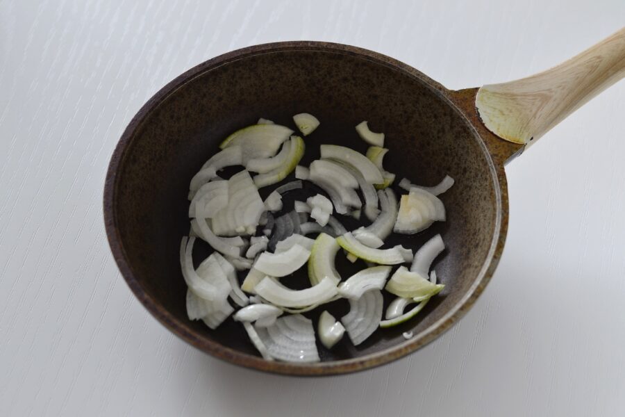 - Place the chopped onion in a hot pan with vegetable oil. Fry over low heat until lightly browned.