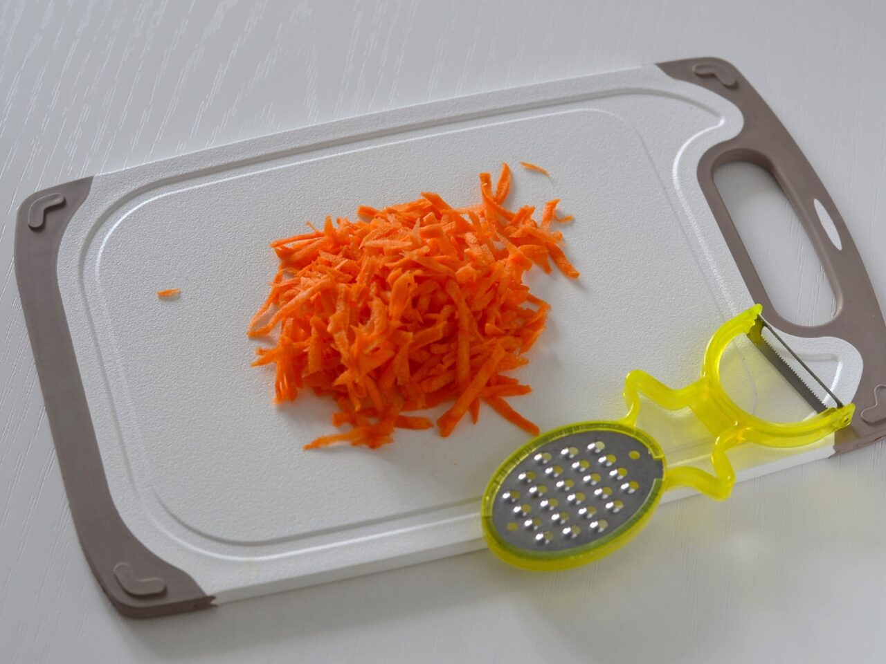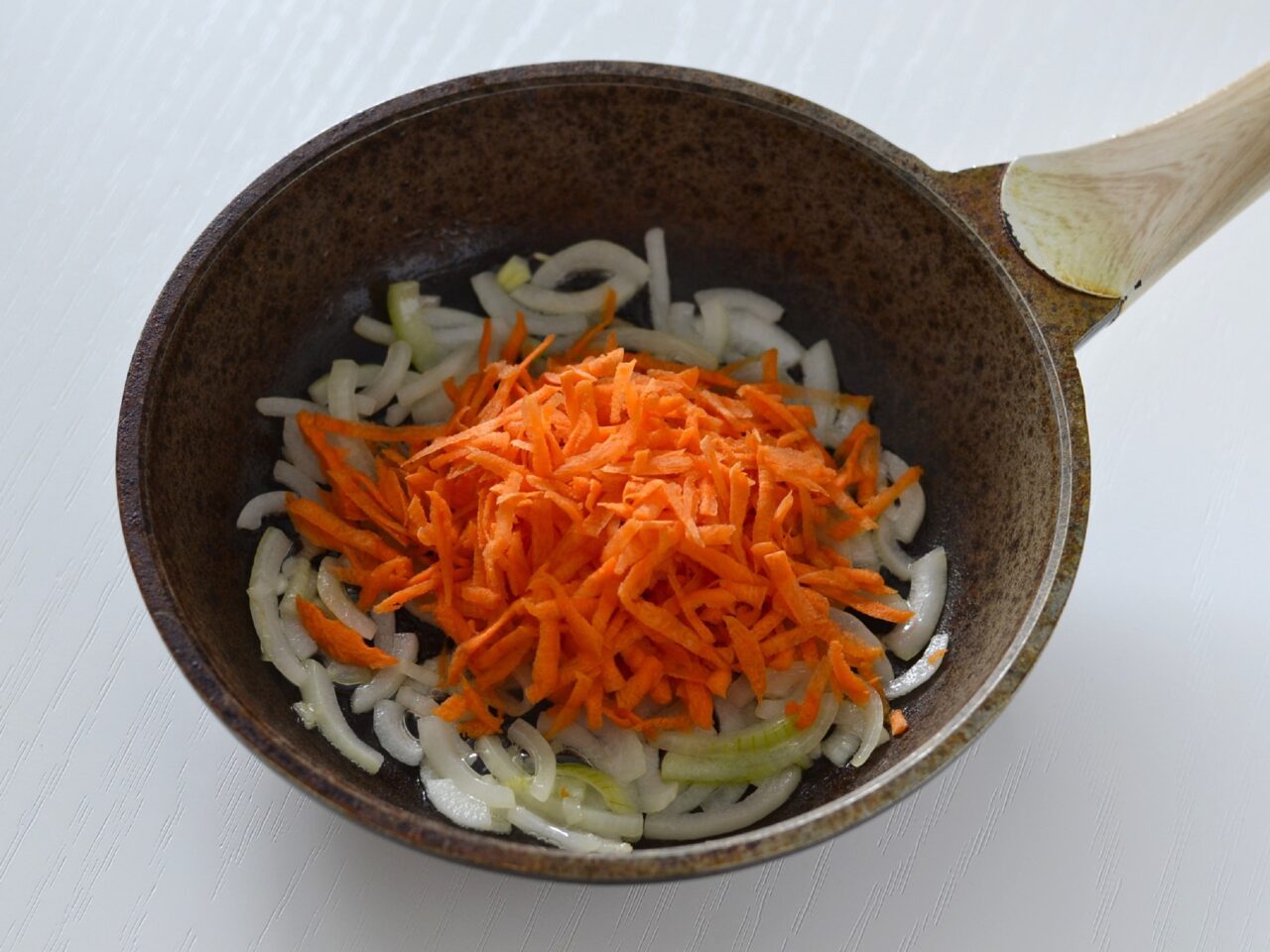 - Add the grated carrots to the pan along with the onions. Continue cooking for about three minutes.