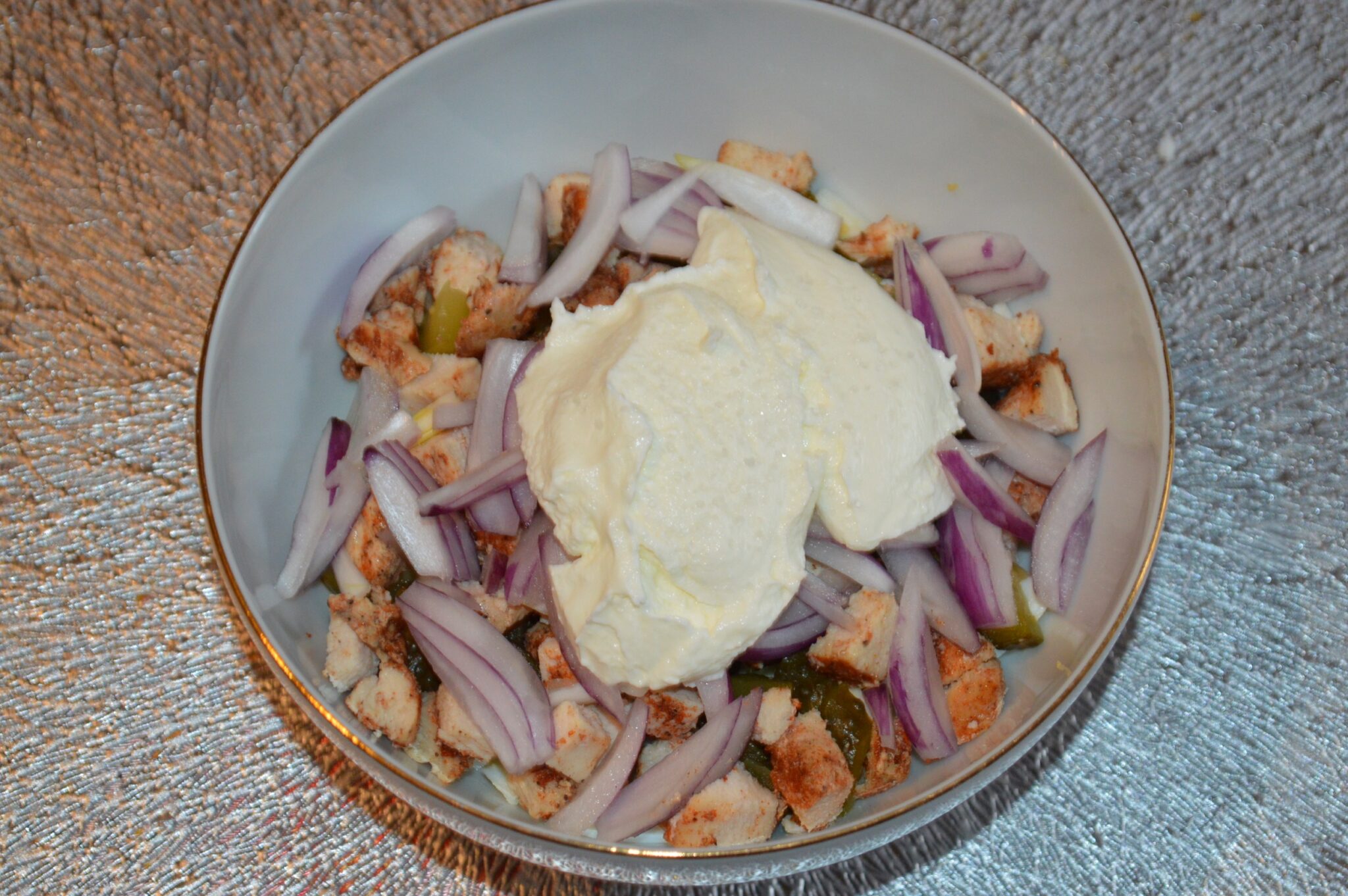 - Add the Greek yogurt to the bowl and sprinkle with salt to taste.