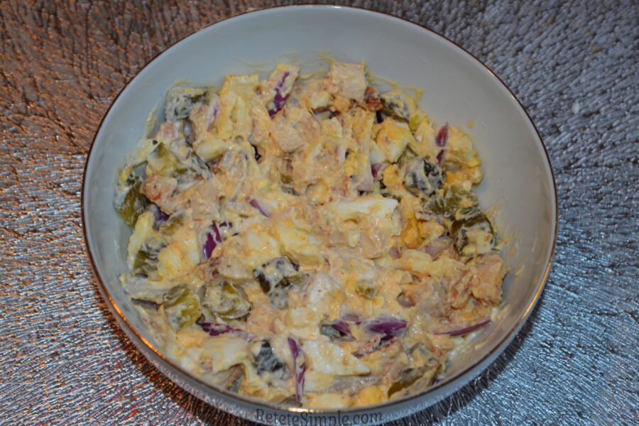 Chicken salad with eggs and pickled cucumbers is an easy and savory recipe, suitable for any meal of the day. Properly cooked chicken provides protein, eggs add consistency, and pickled cucumbers give a fresh and balanced taste. The dish is quick to prepare and served cold, making it ideal for lunch, dinner, or a packed meal.