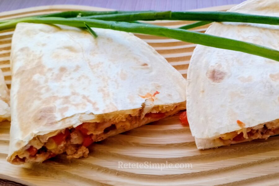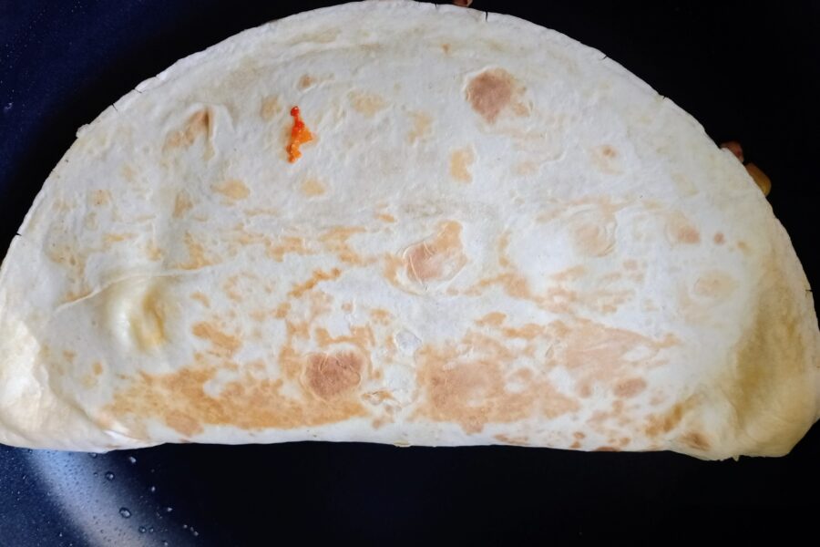 - Fold the tortilla in half and fry it in a dry pan. The cheese will melt on both sides and hold the filling inside the tortilla.