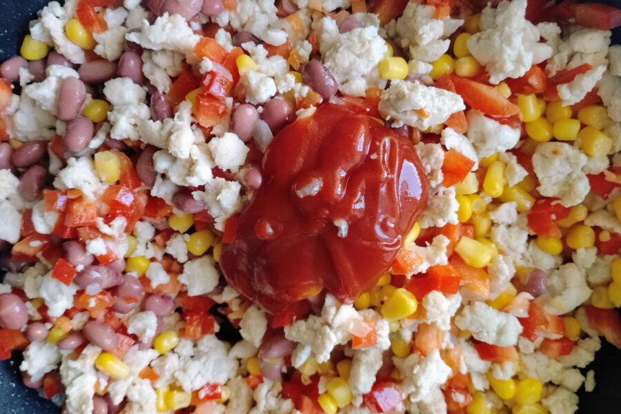 - Add salt to the mixture of ingredients, add the desired spices and tomato paste. Mix again.