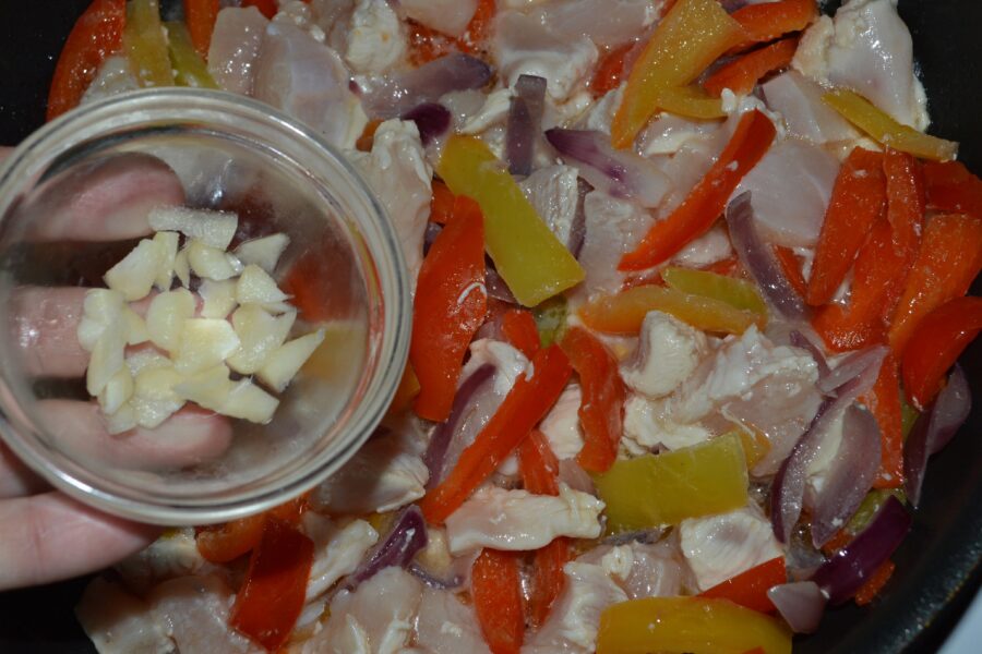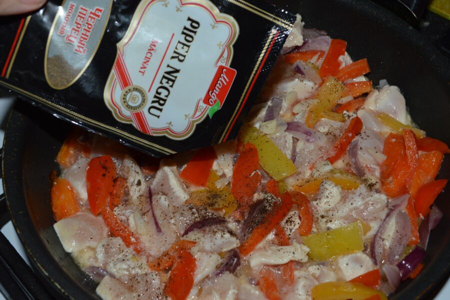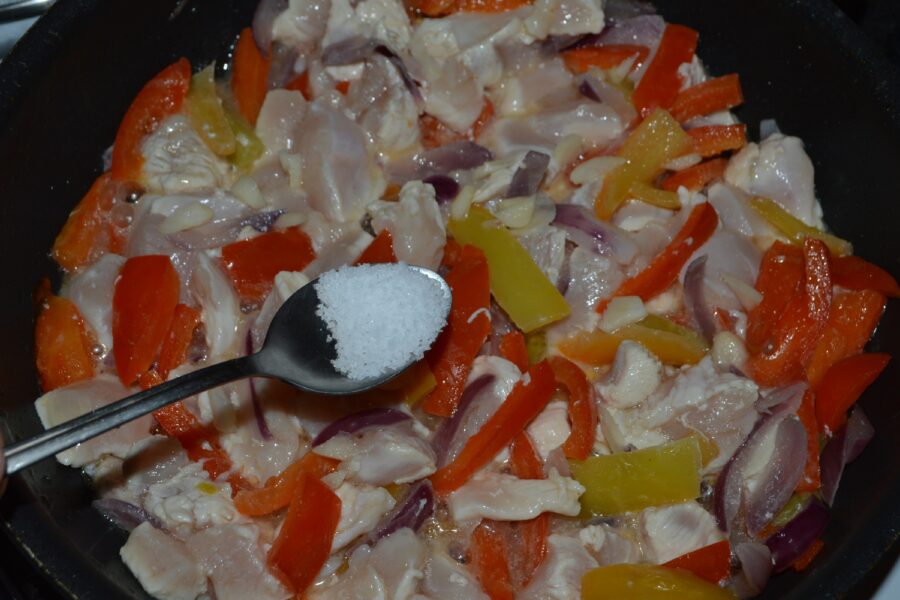 - Heat a little oil in a pan, then add the peppers and onions. Sauté for 5 minutes over low heat, covered.