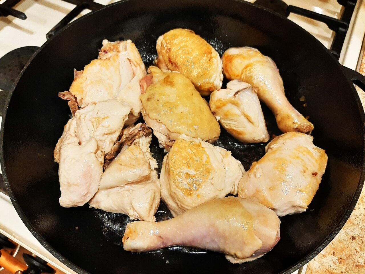 - Pour refined vegetable oil into a hot pan. Fry the chicken pieces on both sides over high heat for 5 minutes. The meat should develop a golden brown crust.